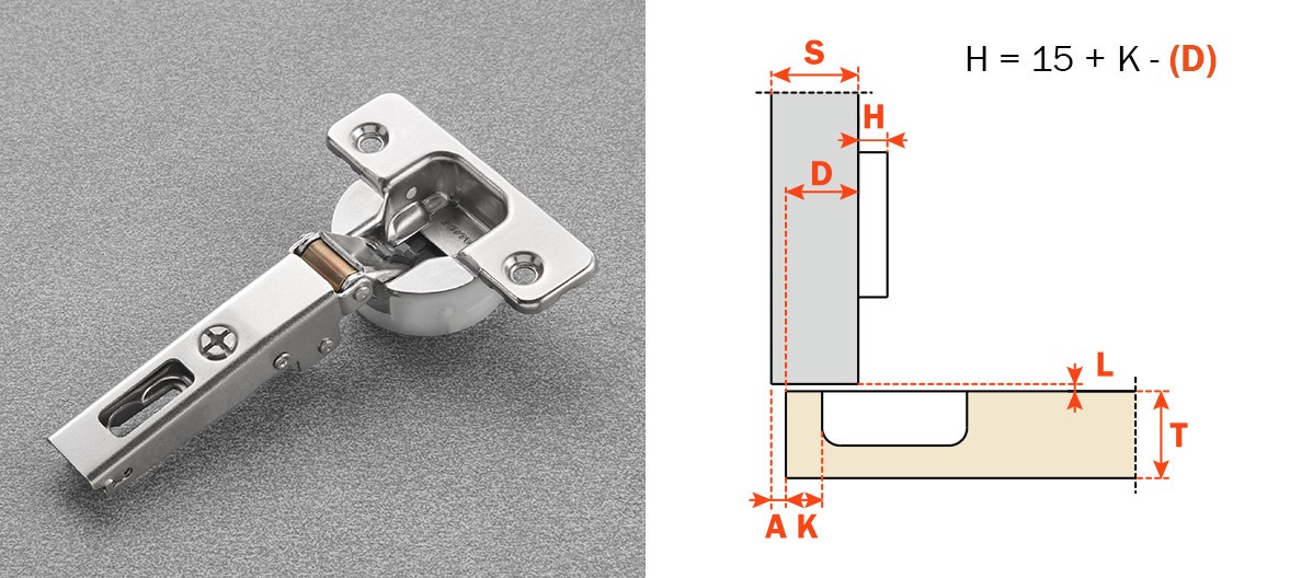 Cerniere con sistema decelerante integrato nella scatolina. C2ABAE9 - Cerniere per ante di spessore min.18 max.35 mm. Profondità della scatolina 15.5 mm. Apertura 94°. Possibilità di foratura dell'anta "K" da 3 a 9 mm.