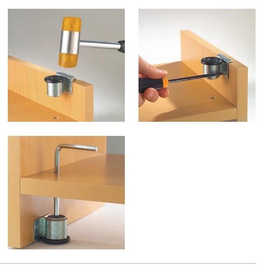 - Regolazione in altezza fino a 20 mm con chiave esagonale da 6 o cacciavite spessore pannello min.12mm.