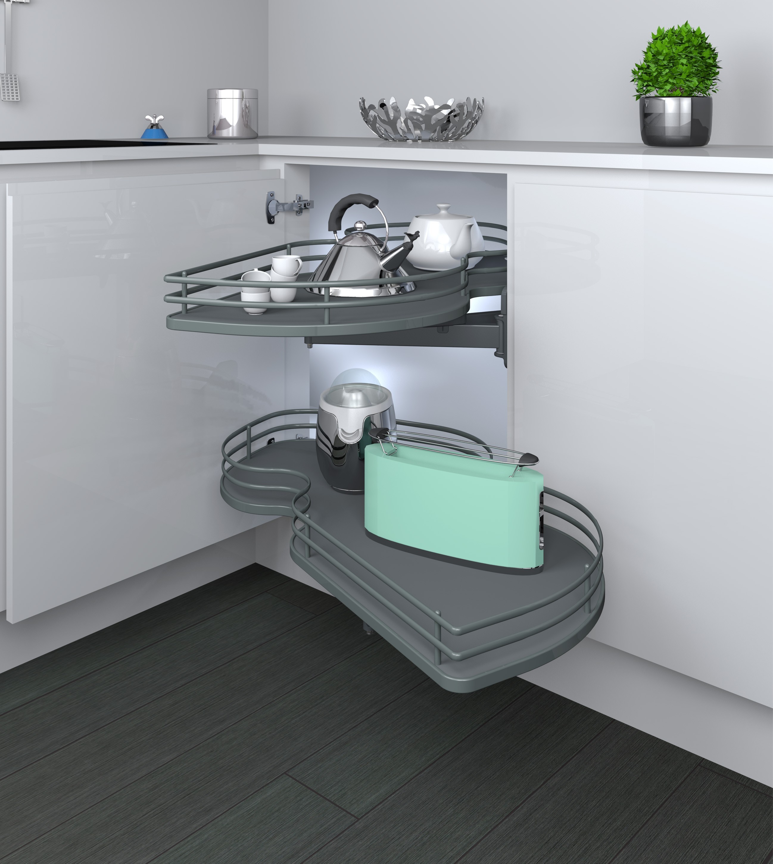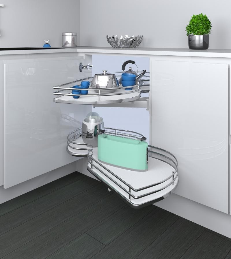 Meccanismo con ripiani girevoli ad estrazione totale per base angolo. Mobile da 90