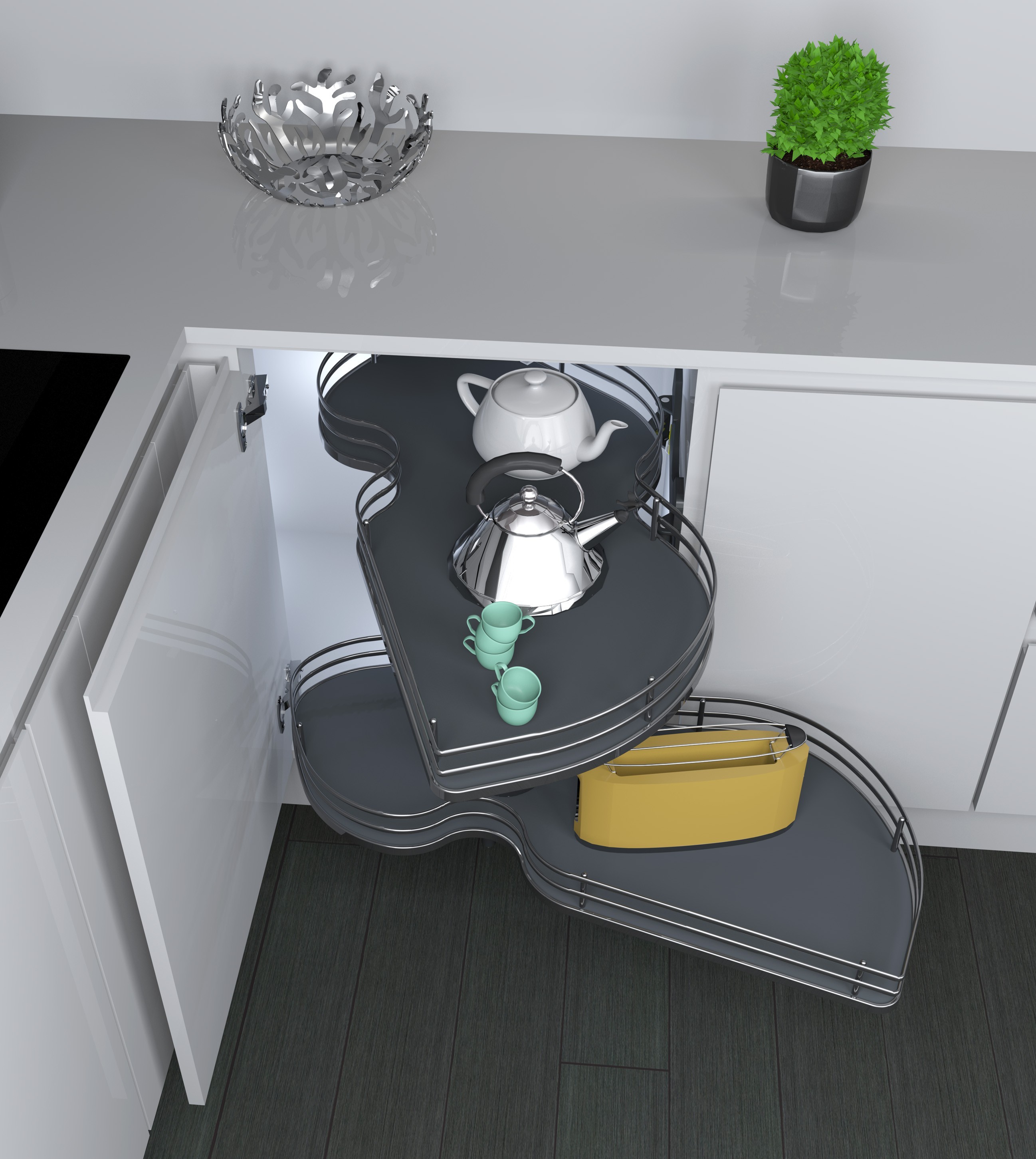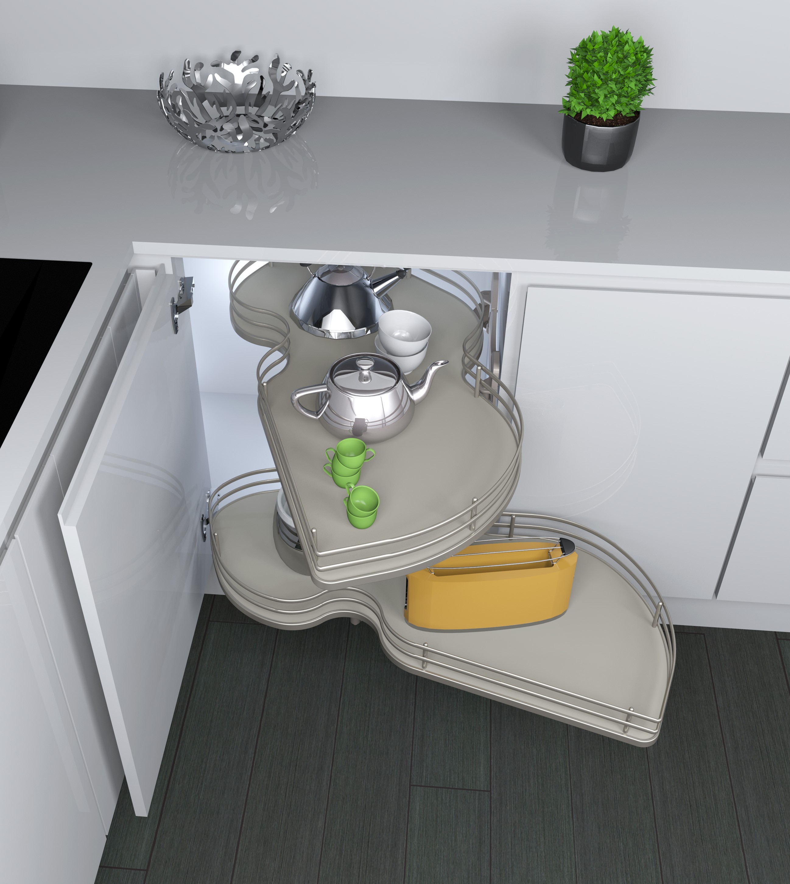 Meccanismo con ripiani girevoli ad estrazione totale per base angolo. Mobile da 90