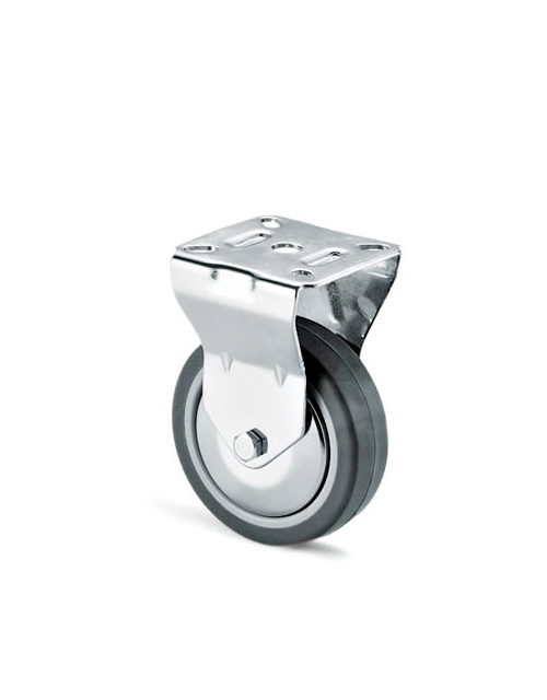 - Ruota in gomma sintetica grigia flangiata in termoplastico con parafili in acciaio stampato cromato lucido.