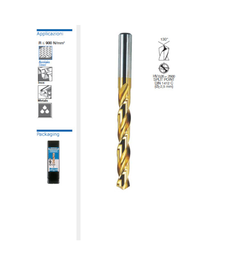 Punte elicoidali cilindriche con rivestimento al nitruro di titanio, per rendimenti elevati e maggiore durata dei taglienti nella foratura degli acciai legati, nelle ghise e nei metalli in genere.Caratteristiche tecniche