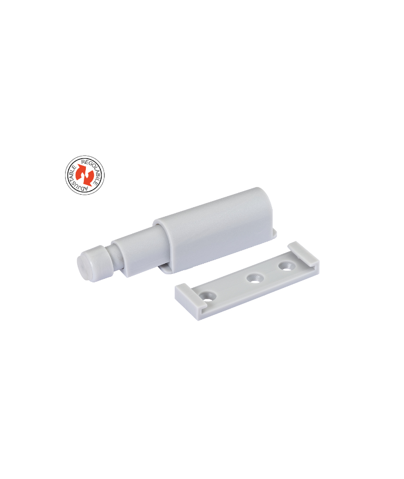 Pistoncino a molla premi apri da inserire all'interno di mobili. Consente con una leggera pressione di aprire l'anta, spostandone in fuori il bordo di 1,3 cm. Testa con regolazione a vite da 0 a 5 mm, fornito con piastrina di fissaggio. VARIANTI: - Con Gommino Paracolpo (da abbinare a cerniere con molla) - Con Magnete (da abbinare a cerniere senza molla)