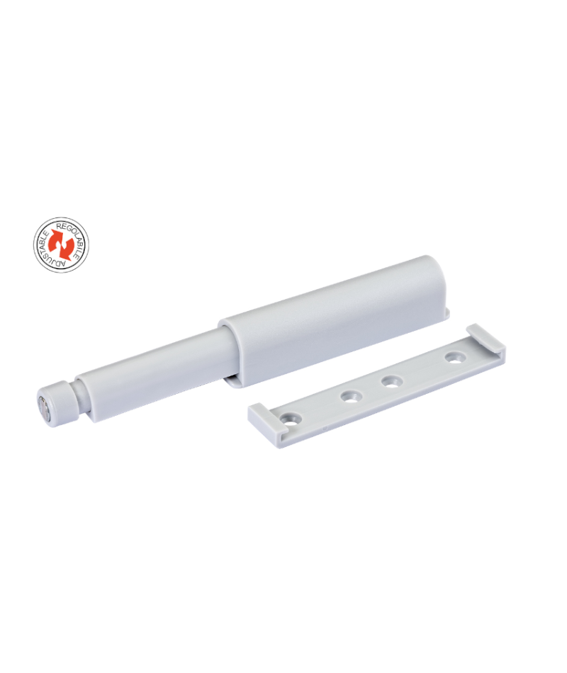 Pistoncino a molla premi apri da inserire all'interno di ante o cassetti. Consente con una leggera pressione di aprire il cassetto o l'anta, spostandone in fuori il bordo di 4 cm. Testa con regolazione a vite da 0 a 5 mm, fornito con piastrina di fissaggio. VARIANTI: - Con Gommino Paracolpo (da abbinare a cerniere con molla) - Con Magnete (da abbinare a cerniere senza molla)
