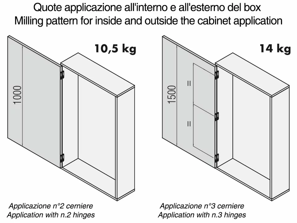 - Portata massima: 10,5 kg (2 cerniere) | 14 kg (3 cerniere) | 19 kg (4 cerniere)