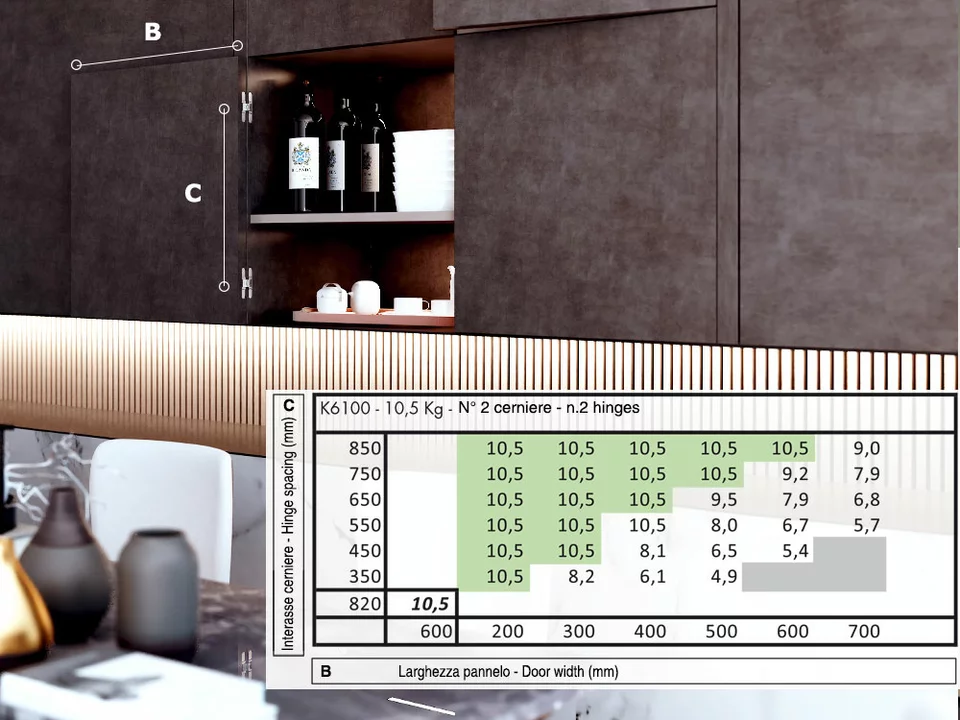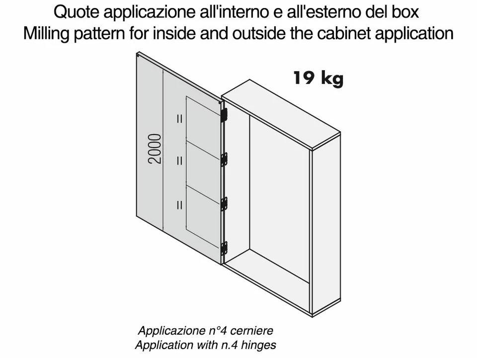 - Portata massima: 10,5 kg (2 cerniere) | 14 kg (3 cerniere) | 19 kg (4 cerniere)